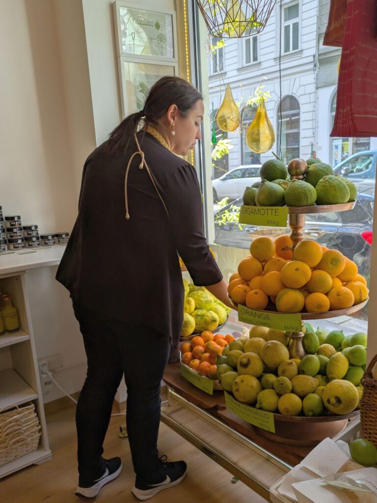 „Täglich kommt Neues an“, berichtet Chiara. Im Fokus liegen vor allem seltene und alte Sorten von Zitrusfrüchten. Immer wieder gibt es Verkostungen und andere Events, wie etwa Schulungen zu Olivenöl, Panettone und mehr. „Ja, weil wenn man nicht kostet, weiß man nichts“, gibt Chiara noch zu bedenken. Kann ich nur unterschreiben.