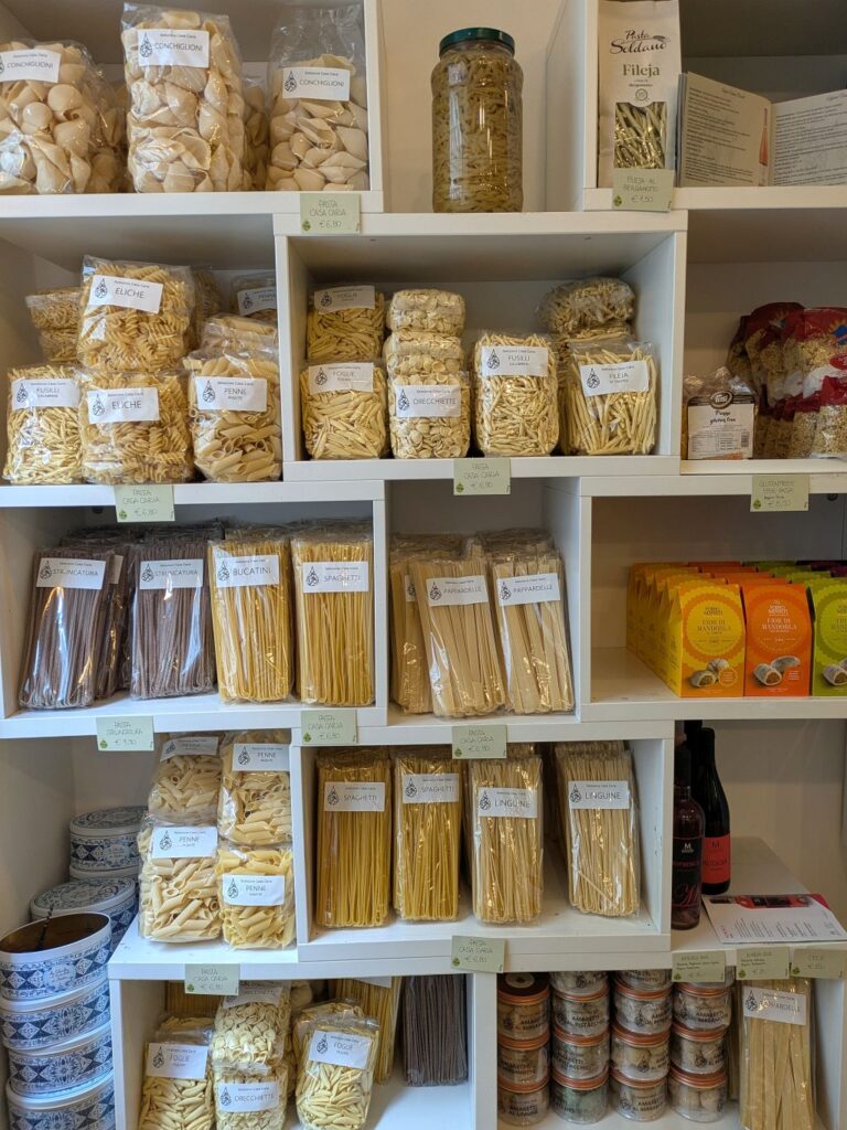 In den Regalen rundum stehen Taralli, Olivenpaté, Olivenöle, Pistazien, Fruchtaufstriche, Wein und vieles mehr in Reih und Glied.